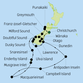 Jour 12 Dusky Sound et Doubtful Sound • Plus au sud, vous atteignez le spectaculaire parc national de Fiordland, situé dans la région du patrimoine mondial de Te Wahipounamu. Ici, sur la côte ouest escarpée de la Nouvelle-Zélande, vous découvrirez les impressionnants fjords Dusky Sound, Doubtful Sound et Milford Sound - des bras de mer profondément encaissés avec des falaises abruptes, une forêt dense et des cascades rugissantes. Lors d’une sortie en Zodiac, vous pourrez observer le timide manchot à bec épais ou, avec un peu de chance, apercevoir des dauphins et des phoques dans leur habitat naturel.