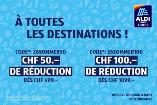*Saisis le code promo lors de ta réservation sur le site aldi-suisse-tours.ch, dans le champ prévu à cet effet durant la dernière étape de la réservation (valable pour tous les nouveaux voyages réservés entre le 15.12.25 et le 01.03.26 pour une période de voyage comprise entre le 01.04. et le 31.10.26. Des bons d'une valeur de CHF 50.- et CHF 100.- sont proposés. Pour une commande d'au moins CHF 499.- tu auras CHF 50.- de réduction, et pour une commande d'au moins CHF 1 099.- tu auras CHF 100.- de réduction sur le prix du voyage. Non cumulable, valable une seule fois par réservation, aucun paiement en espèces ni utilisation partielle possible. Pas valable sur les croisières AIDA.)